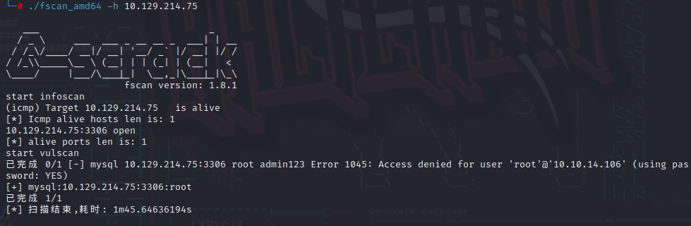 发现 3306 端口开放,3306 是 mysql 数据库的常用端口,用命令进行连接
