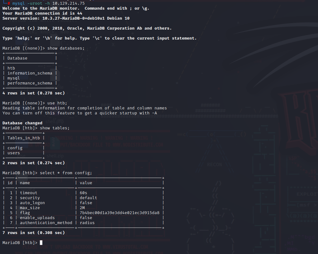 总结:该台靶机的考点就在于 3306 端口开放的 mysql 服务,通过命令无密码连接之后利用 sql 语句去查找表中的字段值