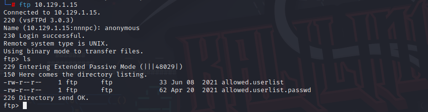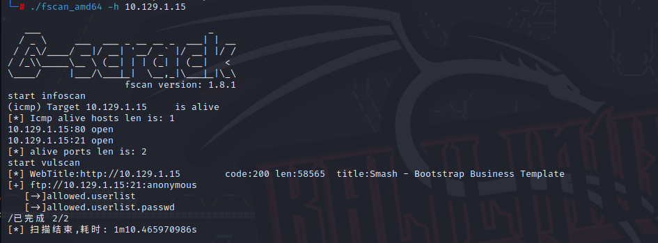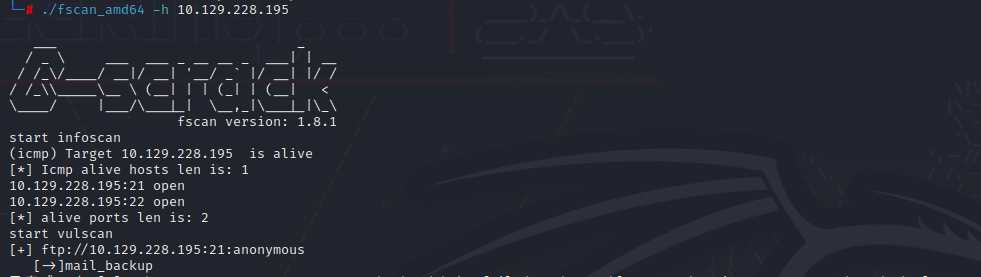 21 端口开放了 ftp 服务,并且扫描结果已经显示出来了 anonymous 可以免密登录