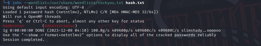 将 hash 保存到 hash.txt 中,使用 john 或者 hashcat 利用 rockyou 字典进行爆破