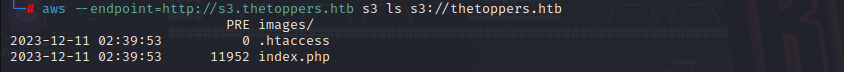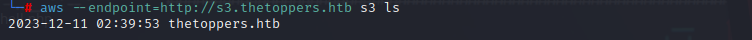 1 | aws --endpoint=http://s3.thetoppers.htb s3 ls |
