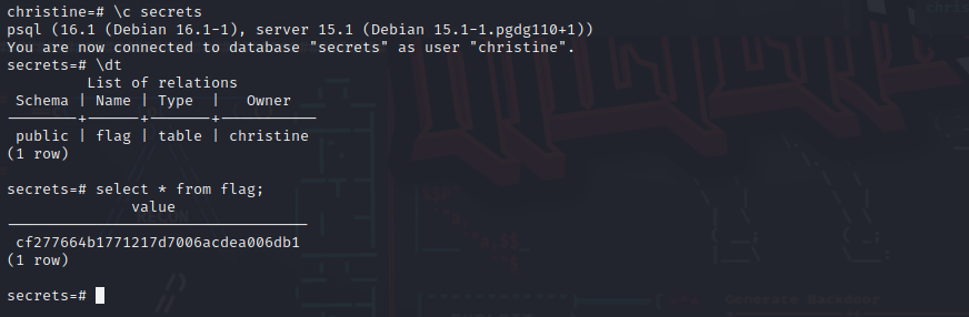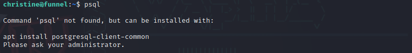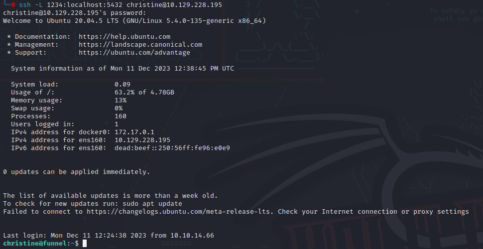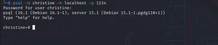 1 | ssh -L 1234:localhost:5432 christine@10.129.228.195 |