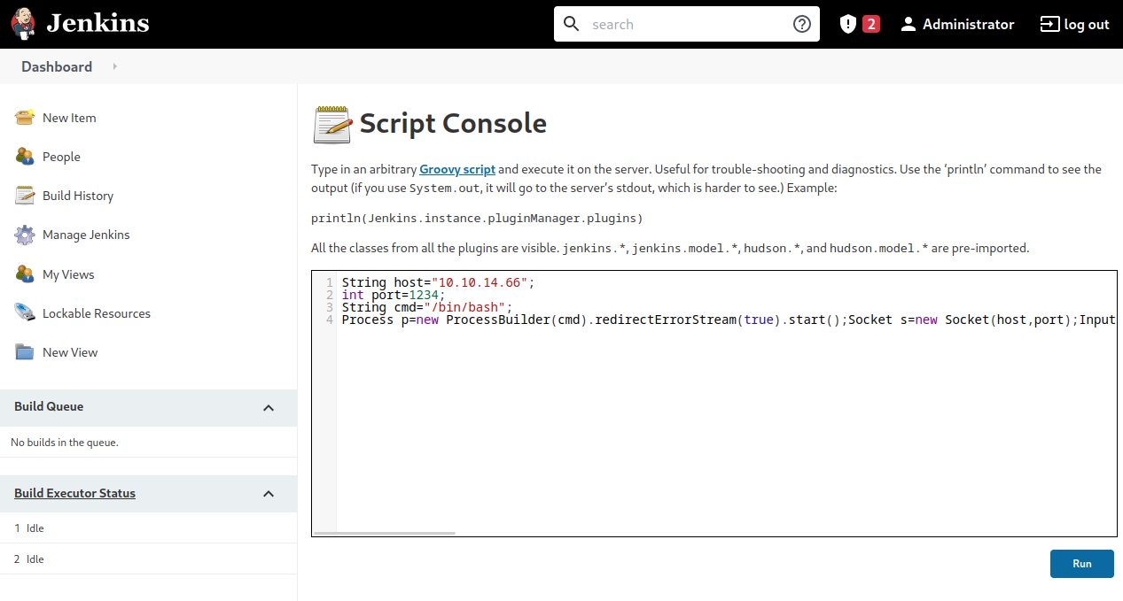 而在 Jenkins 的脚本控制台中,可以编写和运行 Groovy 脚本,我们就可以插入反弹 shell 的 Groovy 脚本