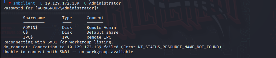 1 | smbclient -L 10.129.172.139 -U Administrator |