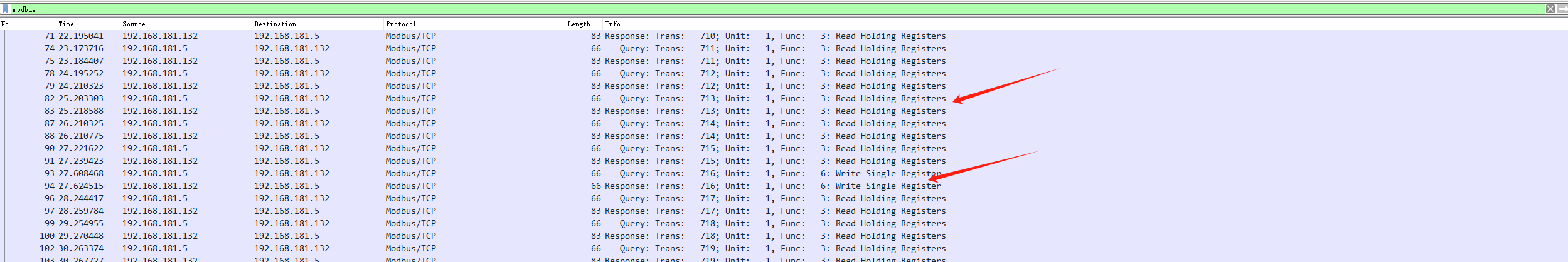 翻了翻,发现该流量包中只有两种功能码,一个是 3(读保持)一个是 6(写单个保持)