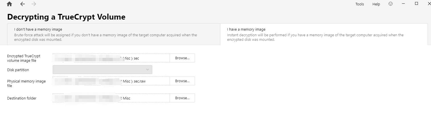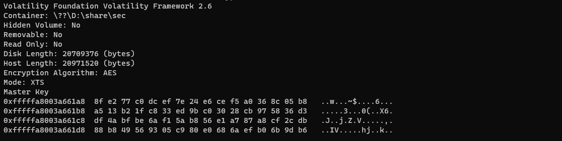 这道题目给出的文件有 TrueCrypt 加密的 sec 文件和内存文件 sec.raw,可以先使用 vol2 对内存文件进行取证拿到密钥